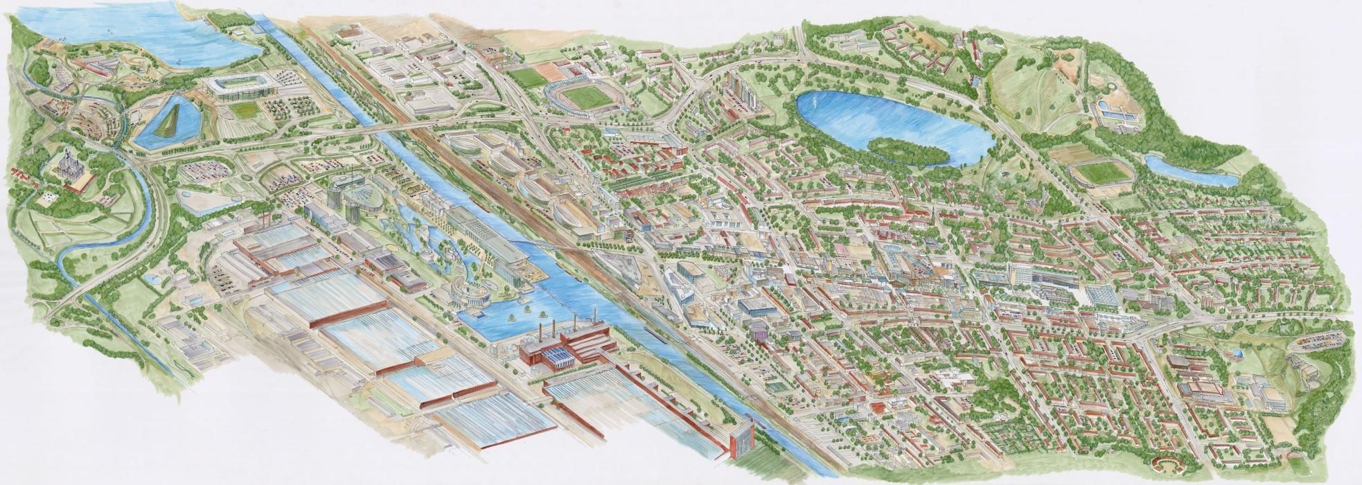 Die Stadt Wolfsburg hat zwar eine große historische Tradition (Welfenschloss), wird aber vor allem von den Entwicklungen des 20. Jahrhunderts dominiert. Als „Stadt des KdF-Wagens“, des „Volkswagens“ musste sie sich im Schatten der größten Autofabrik als Bürgerstadt erst finden. Sie nutzte das zum Aufstieg als Stadt der Moderne aber auch durch die Integration der bestehenden Kleinstädte mit ihren historischen Bereichen. Die Magistrale des Autozeitalters, die Porschestraße ist inzwischen zur Fußgängerzone geworden, die das Werk und die Erlebniswelt der „Autostadt“ mit dem Zentrum und den Kulturorten der Moderne (Theater, Museen, Kulturhaus) verbindet. Die Vogelperspektive wurde für einen Architekturführer genutzt.