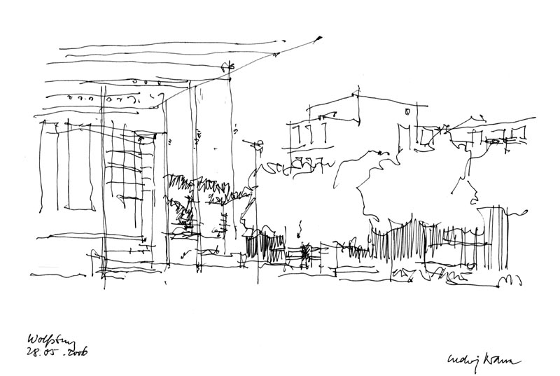 Die Stadt Wolfsburg hat zwar eine große historische Tradition (Welfenschloss), wird aber vor allem von den Entwicklungen des 20. Jahrhunderts dominiert. Als „Stadt des KdF-Wagens“, des „Volkswagens“ musste sie sich im Schatten der größten Autofabrik als Bürgerstadt erst finden. Sie nutzte das zum Aufstieg als Stadt der Moderne aber auch durch die Integration der bestehenden Kleinstädte mit ihren historischen Bereichen. Die Magistrale des Autozeitalters, die Porschestraße ist inzwischen zur Fußgängerzone geworden, die das Werk und die Erlebniswelt der „Autostadt“ mit dem Zentrum und den Kulturorten der Moderne (Theater, Museen, Kulturhaus) verbindet. Die Vogelperspektive wurde für einen Architekturführer genutzt.