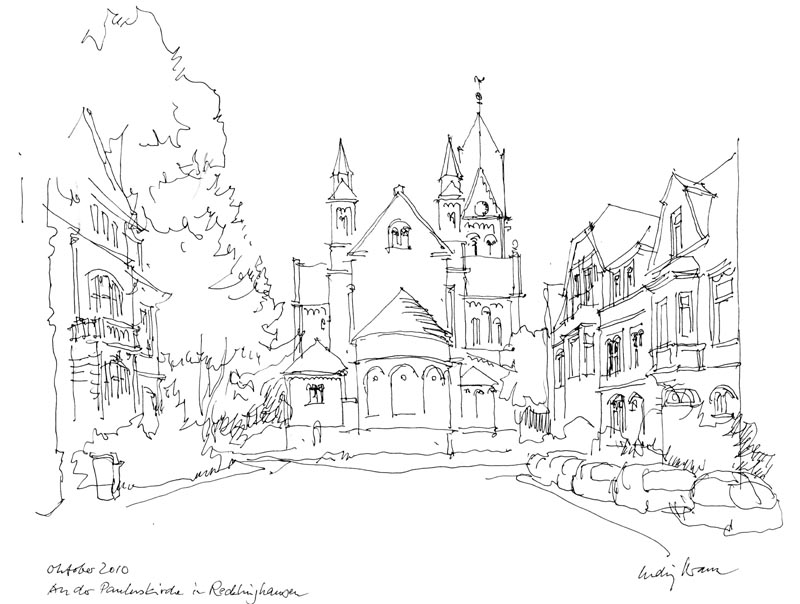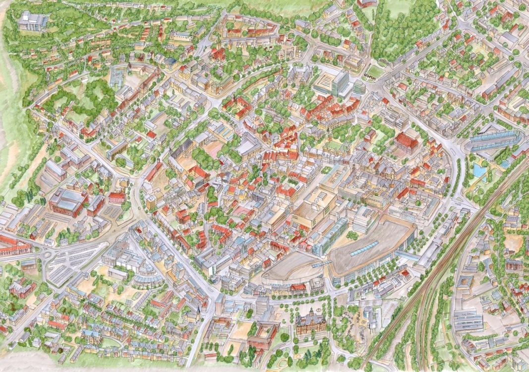 Vogelperspektive der Innenstadt (120×100cm) sowie Skizzen aus der Fußgängerperspektive
