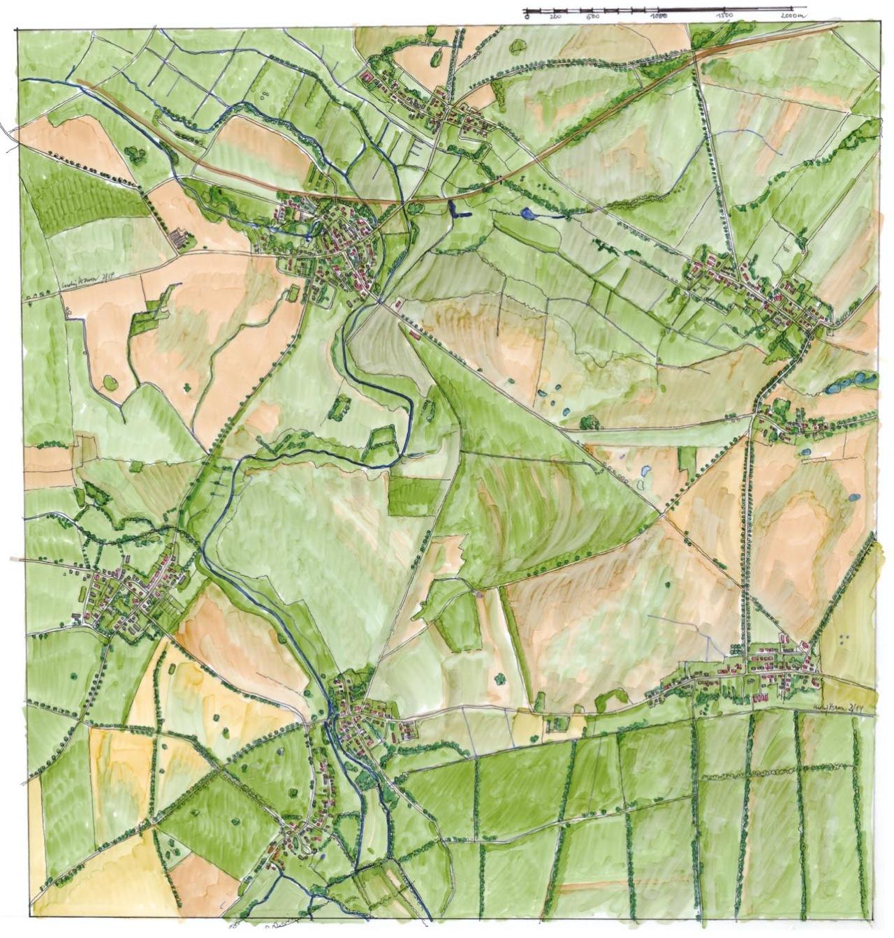 Karten, Vogelperspektiven und Handzeichnungen geben Einblick in das räumliche Umfeld. Die Dokumentation zeigt die Luftbilder der Gesamtgemeinde sowie der 6 einzelnen Orte. Die farbigen Vogelperspektiven werden ergänzt durch Skizzen der Ortskerne, von Gutshäusern, und Kirchen.